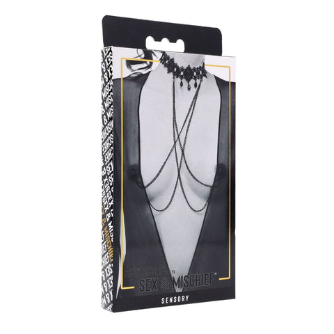 Dripping with dark elegance and sensual allure, the Lace Collar with Nipple Ties is designed for those who crave a touch of the unexpected. This ornate lace collar wraps comfortably around the neck, featuring an adjustable bra-strap-style back for the perfect fit. Glistening black gem stones dangle delicately from the collar, drawing attention to the neckline while adding a touch of mystery. The black double-chain draping connects effortlessly to adjustable nipple ties, offering a subtle yet seductive thrill. Designed to be stylish, sexy and discreet, this piece is perfect for those looking to turn up the heat - whether in public or behind closed doors.
